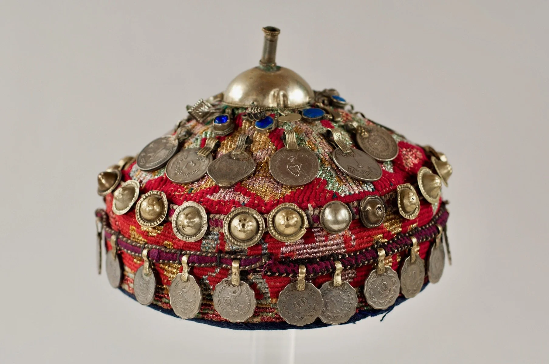 Likely worn by an unmarried woman, the skullcap would typically have been topped with a scarf. The red color of the hat suggests magical properties, and the coins and other silver pieces were believed to keep the wearer safe by reflecting away evil spirits.