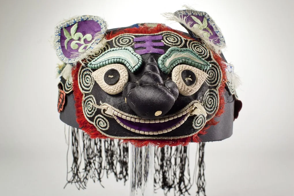 More than a century ago, child mortality was a problem in many countries due to infectious diseases, poor sanitation and limited access to medical care. In China, mothers made hats with animal faces whose fierce expressions and sharp teeth were intended to protect their children by frightening away evil spirits. Many of the decorations on the hats expressed the hope for good fortune and prosperity. The Chinese character on the front of this hat, wang 王, means “king.”