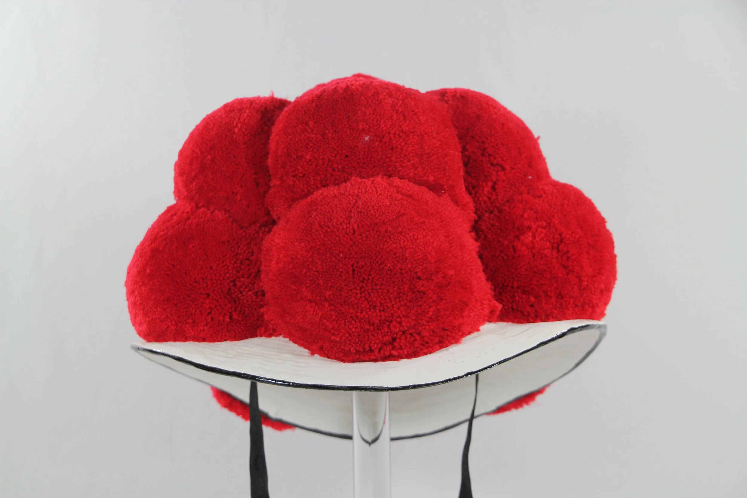 Made of white-washed straw and covered with 14 pompoms, the bollenhut has been worn since the mid 18th C by Protestant women in three villages in the Black Forest, where the majority of the population is Catholic. Unmarried women wore hats with red pompoms, married women covered their hats with black ones.